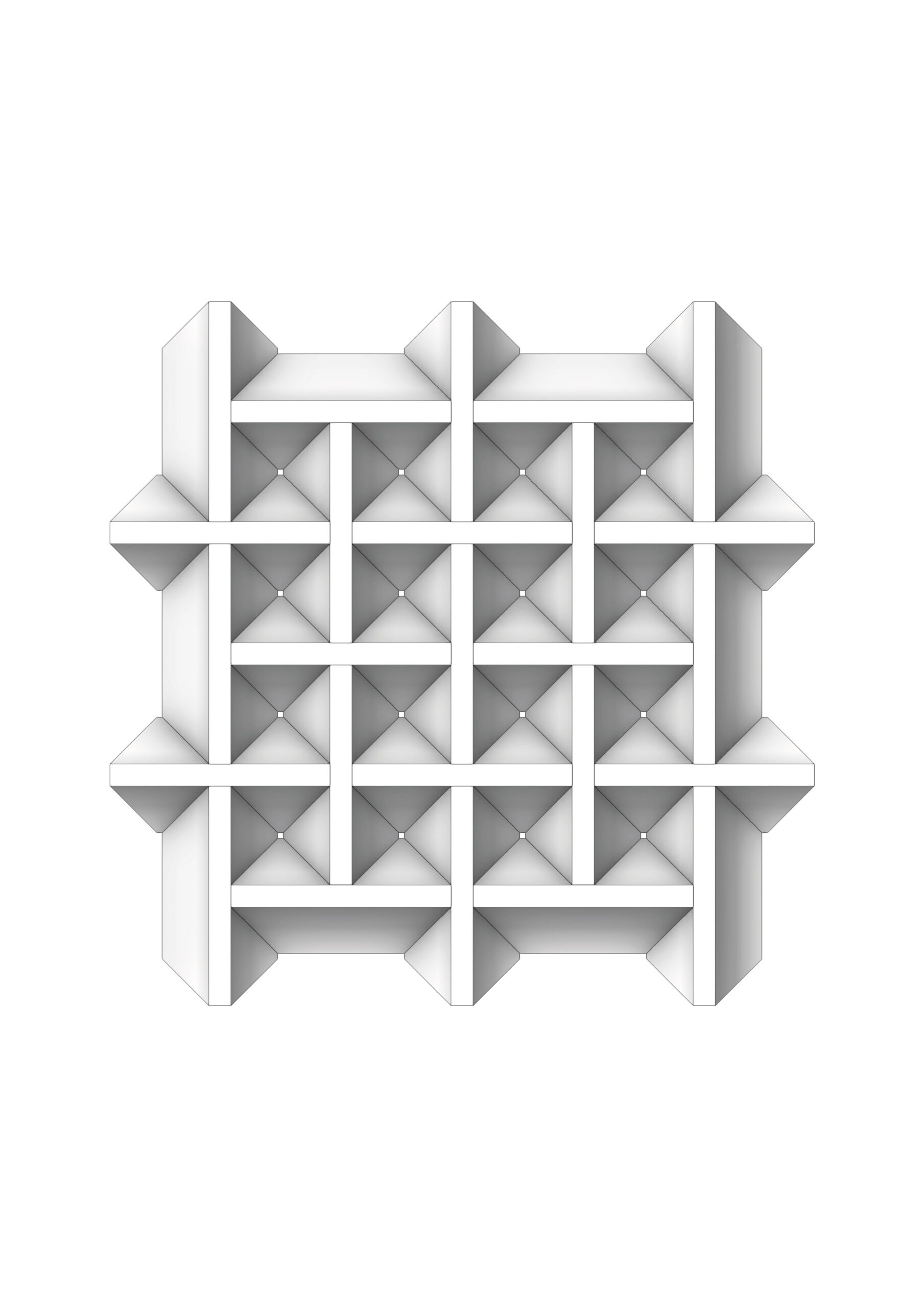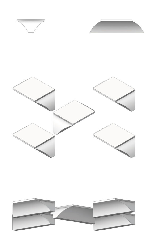 In a next step we tried to adapt the principles of this piece of furniture to a construction of architecture. As a bench has to carry the person dwelling on it a building has to support its roof and the forces that come with it. Our approach is a variation of the roof from Abaille and forms a grid with one type of stone. From the trapezoi-dal shape, which favours the flow of forces, the stone can take different shapes. The sides can be round or angled, the roof open or closed.